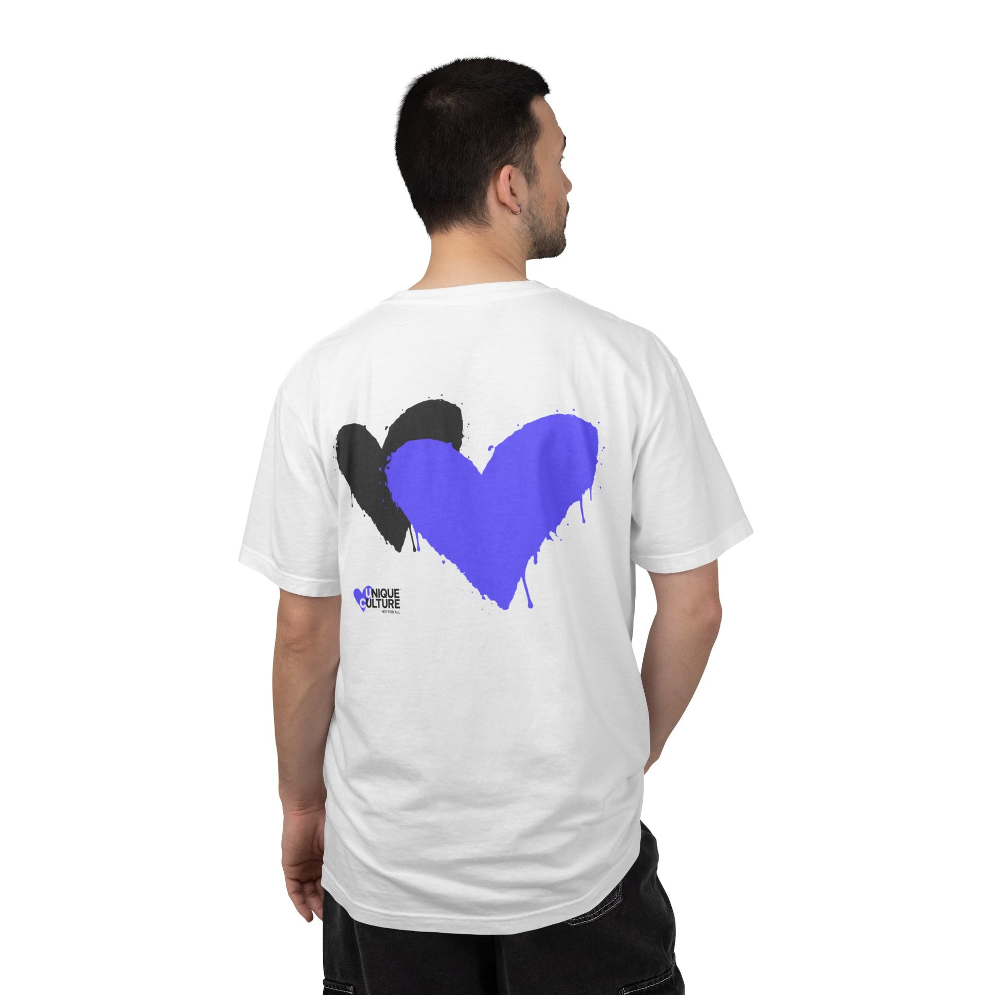 Côté design, l’équilibre est volontairement minimaliste. À l’avant, un logo poitrine discret conserve une esthétique propre et élégante. À l’arrière, un imprimé graphique streetwear façon mantra — UNIQUE CULTURE™ – Black & Blue Heart — apporte une dimension culturelle et introspective, typique des t-shirts imprimés dos streetwear inspirés de la culture urbaine moderne. Ce contraste fait de ce modèle un t-shirt graphique unisexe qui fonctionne aussi bien dans une tenue minimaliste que dans un look urbain plus affirmé.