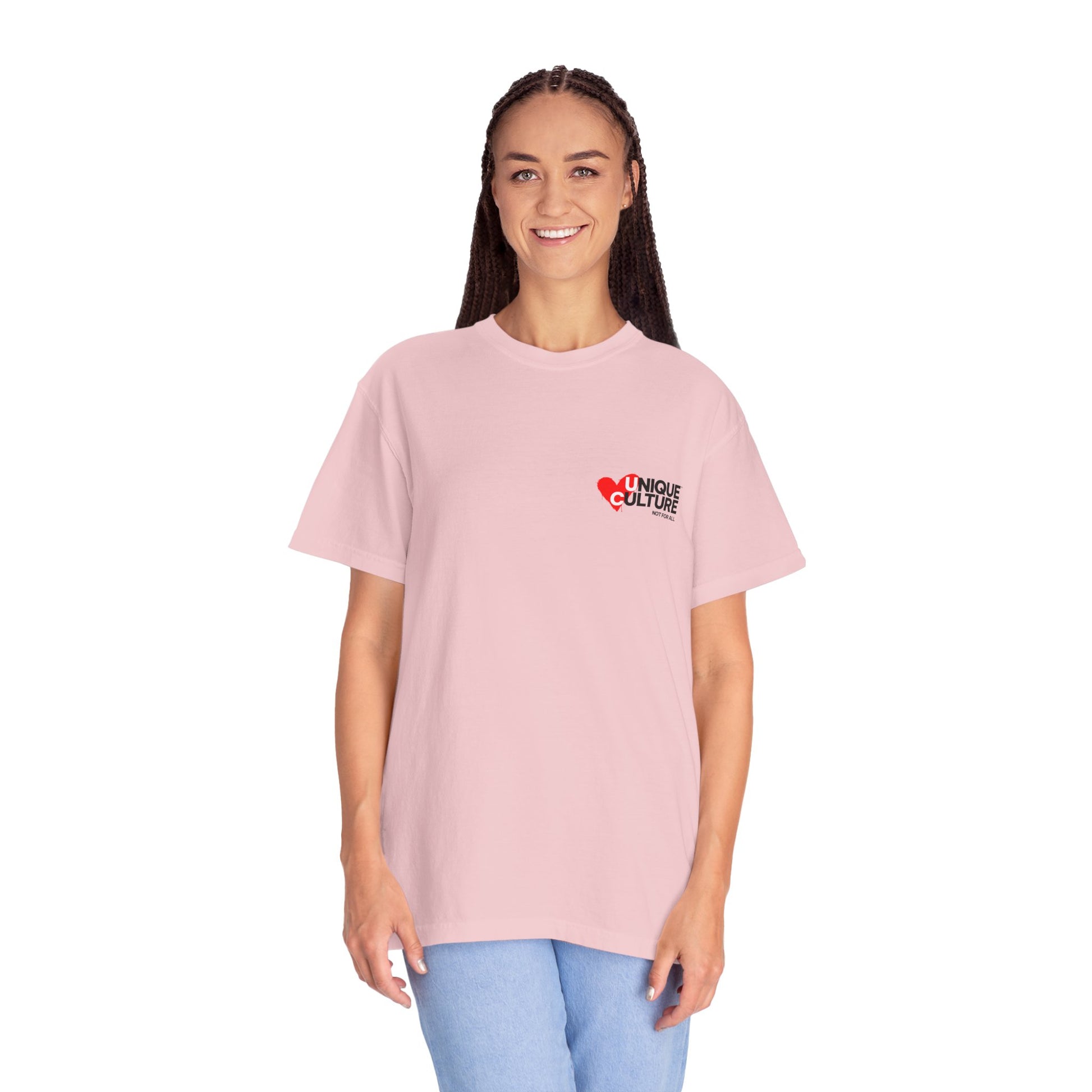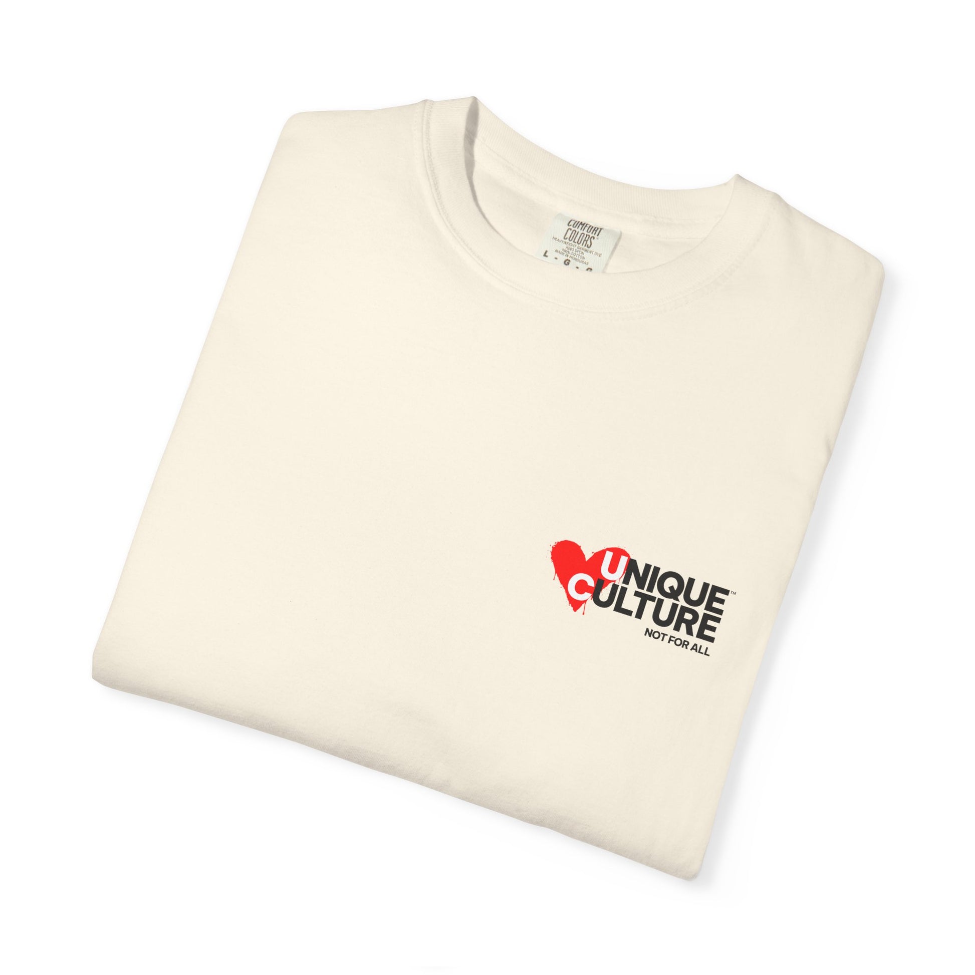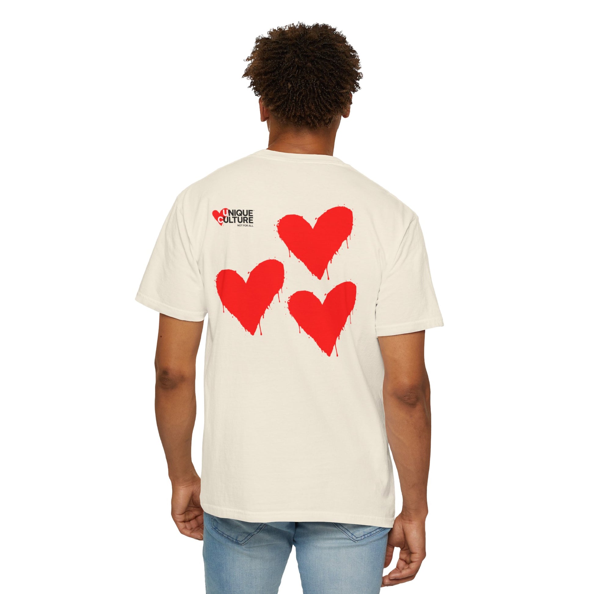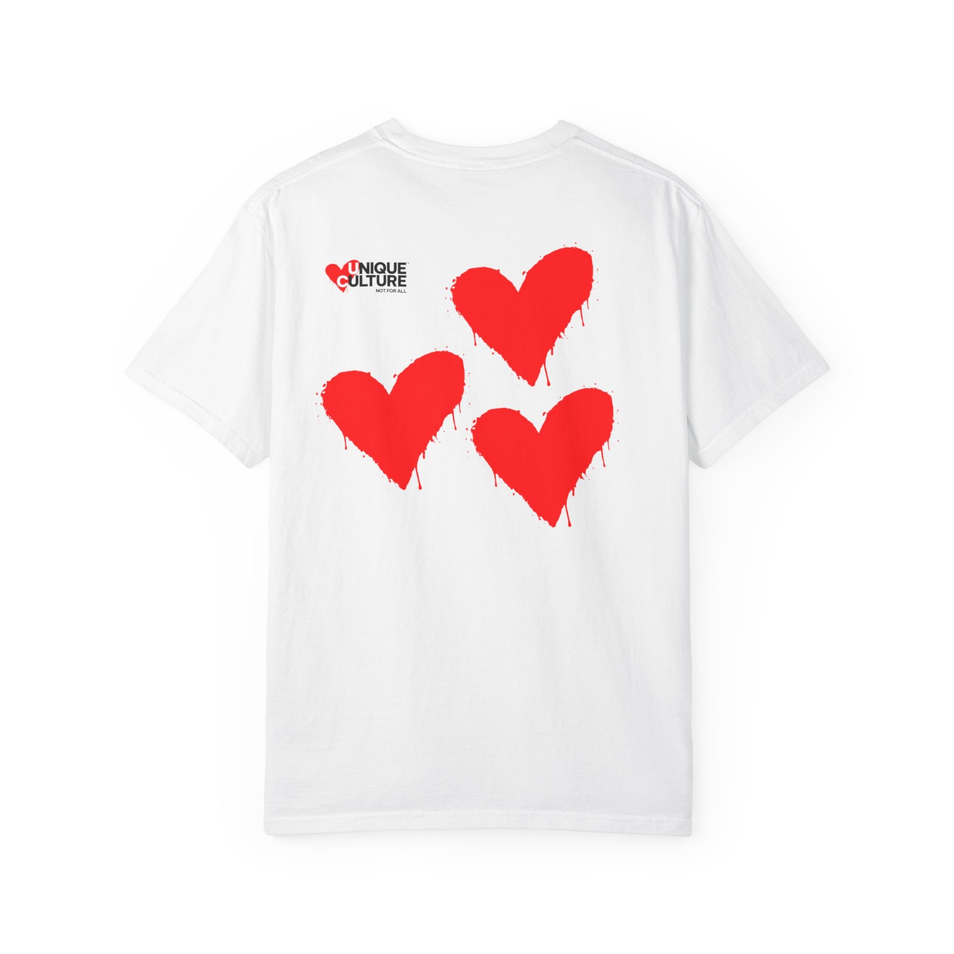 Côté design, l’équilibre est volontairement minimaliste. À l’avant, un logo poitrine discret conserve une esthétique propre et élégante. À l’arrière, un imprimé graphique streetwear façon mantra — UNIQUE CULTURE™ – Triple Heart — apporte une dimension culturelle et introspective, typique des t-shirts imprimés dos streetwear inspirés de la culture urbaine moderne. Ce contraste fait de ce modèle un t-shirt graphique unisexe qui fonctionne aussi bien dans une tenue minimaliste que dans un look urbain plus affirmé.